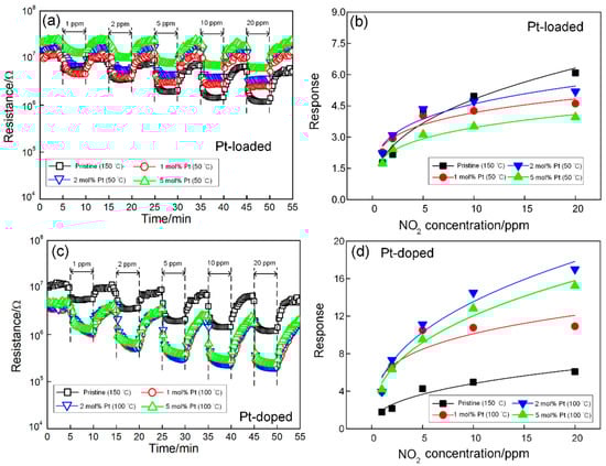 (a,c) Response–recovery curves of the sensors based on pristine CuO, Pt@CuO and Pt-CuO with different Pt concentrations to NO2 at respective optimal operating temperature. (b,d) The evolution of sensor response on the function of NO2 concentration.