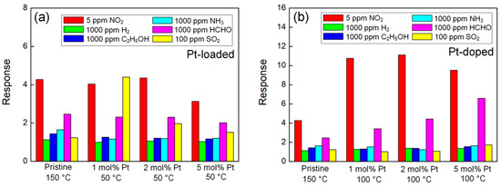 The selectivity of the sensor is also an important parameter for gas sensing [36]. A sensor with good selectivity can avoid the cross-interference of the gas and improve the reliability of the response and the response to the target gas [37]. Figure 7 compares the responses of Pt@CuO, Pt-CuO, and pristine CuO to 5 ppm NO2, 1000 ppm H2, 1000 ppm C2H5OH, 1000 ppm NH3, 1000 ppm HCHO, and 100 ppm SO2 gases at their respective optimal operating temperatures. Figure 7a shows that Pt loading was not able to increase the NO2 gas selectivity of CuO, and 1 mol% Pt@CuO and 5 mol% Pt@CuO even reduced the response to NO2 and improved the response to SO2, resulting in the deterioration of the NO2 gas selectivity of CuO. As shown in Figure 7b, compared with pristine CuO nanorods, 1 mol% Pt-CuO and 2 mol% Pt-CuO improved the NO2 gas response but did not significantly improve the selectivity for other gases at the same time, so the selectivity of CuO to NO2 gas was effectively improved. As the response of 5 mol% Pt-CuO to HCHO is also greatly improved, the NO2 gas selectivity of Pt-CuO becomes worse.
