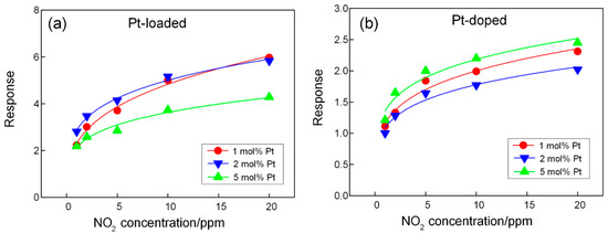 For Pt-loaded CuO, chemical sensitization plays a greater role, and for Pt-doped CuO, the opposite is true. Since most of the Pt deposited in Pt-loaded CuO forms particles on the CuO surface, the gas-sensitive response of the surface is closely related to its sensitivity. As the relative adsorbed oxygen content, based on XPS calculations, on the Pt-loaded CuO surface at room temperature is higher than that on Pt-doped CuO and the electron affinity for NO2 is stronger than that for oxygen, there will be more NO2 molecules adsorbed onto the Pt-loaded CuO surface at room temperature [46]. Thus, the Pt-loaded CuO sample exhibited good room-temperature gas-sensing performance.