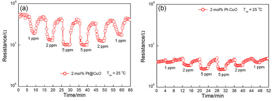 Table 1 shows the reported sensing performance of various noble-metal-functionalized MOS-based sensors toward NO2. It can be clearly seen that both Pt-CuO and Pt@CuO in this work exhibit outstanding comprehensive performance with good responses and short response/recovery times for low concentrations of NO2. In addition, Figure 9 compares the reproducibility curves of 2 mol% Pt-CuO and 2 mol% Pt@CuO for (1–5 ppm) NO2 gases at 25 °C. All of the materials show consistent resistance change reproducibility, that is, good detection reversibility.