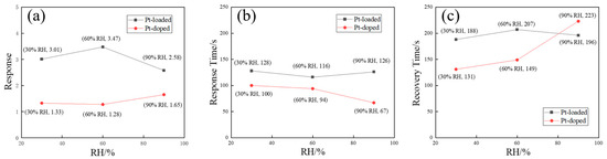 CuO functionalized with 2 mol% Pt exhibits excellent resistance to humidity interference when used for NO2 detection at 25 °C, as illustrated in Figure 10. The influence of humidity on the response is negligible. At relative humidity levels of 30%, 60%, and 90%, CuO loaded with Pt demonstrates responses of 3.01, 3.47, and 2.58 toward 2 ppm NO2, while responses of 1.33, 1.28, and 1.65 are obtained by Pt-doped CuO. Furthermore, the response and recovery times remain relatively stable across different humidity levels for both functionalization modes of CuO toward 2 ppm NO2, as shown in Figure 10b,c. The response and recovery curves for both functionalization modes of CuO toward 2 ppm NO2 at different humidities are shown in Figure S4.