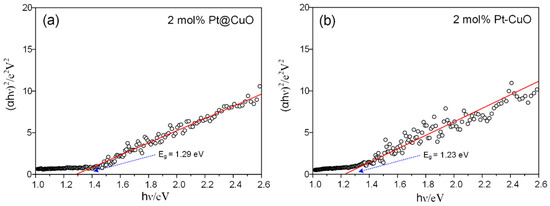 However, changes in the band gap of noble-metal-functionalized semiconductors can alter the sensitivity of gas detection, as the concentration of electrons involved in gas-sensing reactions also plays an important role. At low temperatures, due to the fact that the carriers of p-type CuO are holes, the hole accumulation layer effect related to the band gap plays a dominant role [50]. The larger the band gap, the more pronounced the effect, resulting in a higher response of Pt-loaded CuO within 50 °C compared to Pt-doped CuO. As the operating temperature further increases, the narrow band gap formed by 2 mol% Pt-CuO leads to an increase in the electron concentration for reacting with NO2 gas, and the response of 2 mol% Pt-CuO to NO2 gas is significantly improved due to the increase in the carrier concentration and mobility [51,52]. The variation in band gap for different functionalization modes is demonstrated in Figure 11, which shows that the band gaps are 1.29 and 1.23 eV for 2 mol% Pt@CuO and 2 mol% Pt-CuO, respectively. The band gap reduction was caused by the formation of impurity bands in the band gap, and the Pt-doping mode can make the band gap narrower [53].