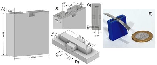 Three-dimensional-printed two-electrodes electrochemical impedance spectroscopy cell: (A) isometric view, (B,C) entrance, (D) cover, and (E) an image of the cell assembled with the inox electrodes and a coin to reference. All dimensions are in millimeters.