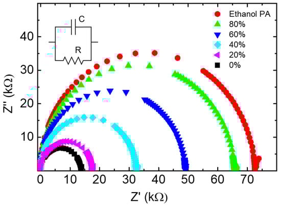 Figure 3 shows that the arc diameter of the Nyquist plots decreases with the increase in water concentration in the solution, reaching the maximum value for the ethanol PA (red dots) and the minimum with DI water (black squares). Therefore, using the 3D cell configuration clearly distinguishes ethanol concentrations in the water/ethanol solutions.