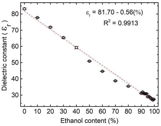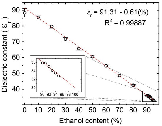 The analysis involves solutions with ethanol concentrations ranging from 0% to 100%. At 0% concentration, the solution contains only water, while at 100%, it contains pure ethanol of PA grade. The linear relation of ethanol content and dielectric constant is shown in Figure 4. The curve fitting makes it possible to predict the percentage of ethanol based on the dielectric constant analyzed in our 3D cell. The slope of the curve obtained for PA ethanol was −0.558 ± 0.012 with an R2 value of 0.9913. The sensibility is obtained through the slope module of the curve, then 0.55 of sensibility for the PA ethanol.