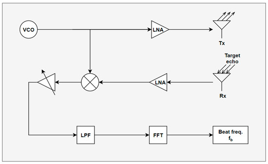Figure 2 delineates the signal processing procedure employed to derive the target distance from the radar. The voltage-controlled oscillator (VCO) generates a FMCW waveform, which is subsequently transmitted by Tx after passing through a low noise amplifier (LNA). The signal received by Rx is then mixed with the VCO-generated signal and amplified. Subsequently, the beat frequency is extracted by eliminating the carrier component through a low-pass filter (LPF). The amplitude of the received signal in the frequency domain determines the target range. Equation (1) represents the beat signal post LPF processing, as depicted in Figure 2.