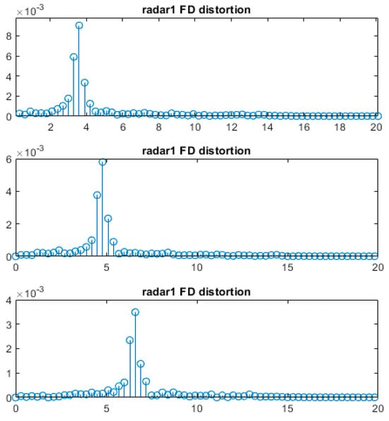 In radar signal processing, when the target’s range R is an integer multiple of the range resolution, it can be expressed using Equation (5). Applying Equation (5) from Equation (2) results in the expression given by Equation (7). In this paper, we consider the target range by separating it into integer multiples and fractional multiples of the range resolution. The target range () can be expressed by Equation (6), where n is the integer multiple range, consistent with the n used in Equation (5), and γ represents the radar’s range resolution. The parameter p defines the fractional multiple range. Substituting this into Equation (2) results in the simplified form presented as Equation (8). It signifies the sinc shift by K. When p equals zero, Sf(n) exhibits zero-crossing sidelobes. Otherwise, for non-zero values of p, Sf(n) follows a sinc shape, where the sidelobes are dependent on the term K. Hence, the sidelobes of Sf(n) shifted by p are dependent on the term K. That is, the sinc pattern of Sf(n) is determined by the term K and is independent of n.