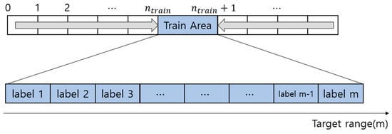 Equation (8) demonstrates the independence of the target’s fractional multiple range from n. Therefore, the proposed approach focuses solely on learning for the fractional multiple range (). The term of can be frequency-shifted for an arbitrary integer (). It serves as the reference value for a frequency shift. Equations (9)–(11) show frequency shift calculation. is the peak index or CFAR detected index. is the difference between and . is the frequency difference multiplied by the bin step , and N denotes the number of FFT points. Figure 4 illustrates the frequency shift using a diagram. The diagram indicates that it is composed of the number of m labels, in which each label represents the distance index with the distance resolution of the bin interval () divided by m. When the beat frequency signal is moved by the frequency shift, all instances of n become .