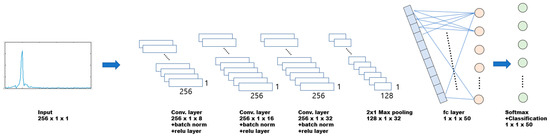 In this paper, the neural network of the FMCW radar is based on a convolutional neural network (CNN). Figure 6 illustrates the proposed CNN architecture designed for inferring radar labels. The input layer utilizes a power-normalized 256-point spectrum. The convolutional layer incorporates 8, 16, and 32 1 × 1 mask filters for each respective layer [13,14,15,16,17,18]. Batch normalization is performed after each convolutional layer, followed by the rectified linear unit activation function [19,20]. The pooling layer has a 1 × 1 pool size and a stride of 2 [21]. Subsequently, the data are fully connected to the m neurons [22,23]. Each neuron calculates the probability for each label via SoftMax, and the reference label is output through the classification layer.