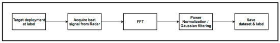 Power normalization is performed to cover the path loss according to the frequency shift. Path loss compensation should be achieved through max peak normalization, avoiding the use of a relational expression. Training data are obtained by measuring within the training region shown in Figure 5. The frequency-shifted signal differs in magnitude from the training data, primarily due to path loss. Power normalization involves dividing the signal by its maximum magnitude. The inference data perform power normalization to mitigate the impact of path loss. This normalization process is applied to the training data to match the main lobe’s magnitude between the two signals. Peak normalization allows the pattern to focus on the sidelobes, which imply a fractional times p in Equation (6). In addition, noise floor cancellation reduces the impact of the environment by removing background noise from the target’s spectrum [3]. In the training and inference phase of the neural network model, Gaussian filters of range resolution size were used to mitigate the effects of integer multiples [12].