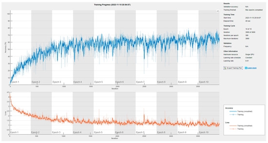 Training data were created using MATLAB simulations. The range resolution was 0.3 m, was 20, m was 50, and was 0.006 m. The position and label of the target had a 1:1 correspondence. The training data added a random range corresponding to 10% of the label range. A thousand data points were used per label. In assuming an indoor environment, the Rician multipath and additive white Gaussian noise were added. Phase error was introduced to the simulation to emulate real-world conditions, with an offset of approximately ±20 ppm from the carrier frequency [2]. Training was conducted using MATLAB, resulting in a training accuracy of 60% and a loss of 1. The accuracy of the label, however, does not show the distance error, and the mean average error was obtained through experiments. Figure 7 and Figure 8 show how to gather the training dataset and the training results, respectively.