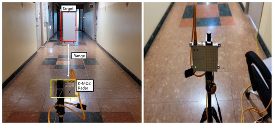 Measurements were conducted in a hallway at Sejong University to validate the proposed algorithm in a real-world setting. The employed radar was an RF-beam K-MD2 FMCW radar, starting at a frequency of 24 GHz with a swept bandwidth of 500 MHz and a range resolution of 0.3 m given in Table 1 [24]. The Gaussian filter used had a 3 dB bandwidth in the impulse response of 1.48 MHz, with an impulse length of 8 samples per symbol and 17 sample points [25,26]. A total of 50,000 training datasets were employed, with each dataset comprising 1000 data points for each label. Figure 9 illustrates the experimental environment. The experiment was conducted by varying the target position within the range of 3 m to 16 m.
