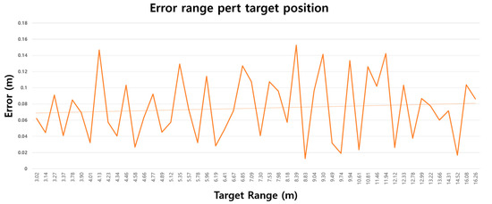 Figure 10 depicts the outcomes obtained by applying the proposed algorithm to the experimental data utilizing real radar measurements. The x-axis represents the distance between the target and the radar, while the y-axis illustrates the disparity between the measured and actual values. The ground truth was acquired through a laser measuring instrument with a precision of ±2 mm. The mean average error (MAE) given in Equation (13) was determined to be 0.07 m.