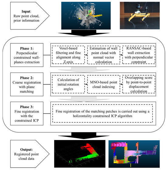 The proposed method comprises three main phases: (1) the initial phase begins with the extraction of perpendicular constrained wall planes from the input point cloud, sourced from the stop-and-go scanning system detailed in our previous study [16]. The point cloud is first subjected to voxel filtering and then downsampled. Subsequently, points presumed to be parts of walls are identified based on their normal vectors. Using the RANSAC-based algorithm, M-SAC wall-plane models adhering to perpendicular constraints are extracted; (2) the second phase involves the alignment of the wall-planes, taking into account the scan system’s initial position. Potential rotation angles are assessed by comparing the normal vector alignment of each wall plane. Overlapping scores for each angle are then computed using a point-to-point displacement analysis. The modifiable-nest-octree-(MNO)-based point cloud indexing technique is utilized to enhance computational efficiency, aiding in the accurate calculation of point-to-point displacements. This computation marks the completion of the coarse registration process and determines the matching patches essential for the next fine registration phase; (3) the final stage focuses on the precise registration of the identified matching patches. A horizontality constrained ICP algorithm is proposed and used for this purpose. The proposed method is automated in all of the phases of the workflow without any manual intervention. Figure 1 illustrates the procedure for the proposed method.