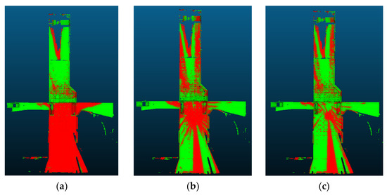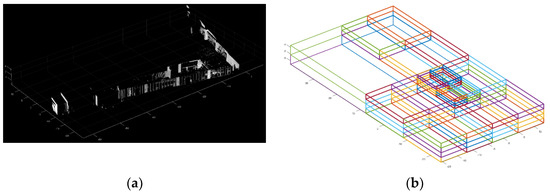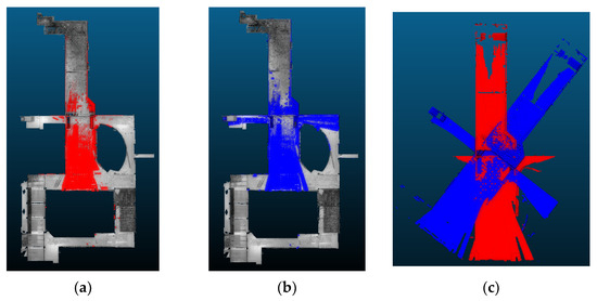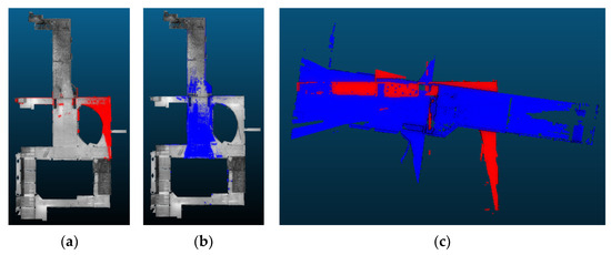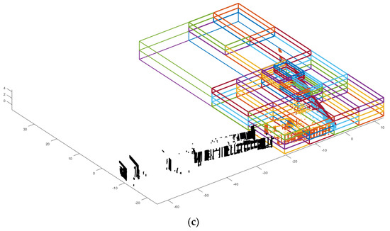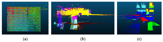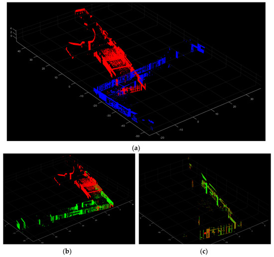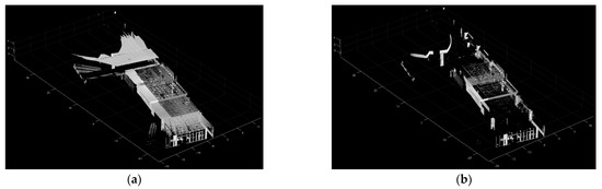 Figure 3 depicts the M-SAC-based wall extraction process. In Figure 3a, the input point cloud is visualized, having been segmented in the preceding section. Figure 3b presents the extracted wall-point cloud, with non-wall points distinctly removed.
