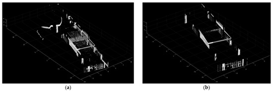 An example of the M-SAC-based wall extraction. (a) Input point cloud; (b) The extracted wall-point cloud. Non-wall points distinctly removed.