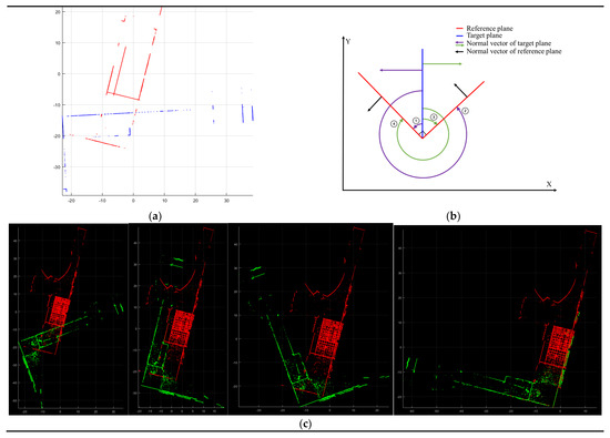 Based on the assumption that all walls are either parallel or perpendicular to each other, a set of rotation candidates, four rotation angles around the Z axis, is proposed for the target wall plane relative to the reference wall plane. In Figure 4a, a top view displays the reference wall planes in red and the target wall planes in blue. Since all target wall planes are either parallel or perpendicular to one another, calculating angular transformations is simplified. This is achieved by aligning a normal vector from one target wall plane to the normal vectors of the two reference wall planes. From the target wall plane, two opposing cases of the normal vector can be estimated. This leads to four distinct angular relationship scenarios, as depicted in Figure 4b. As a result, four temporary transformed target point clouds (green) are generated based on the set of rotation candidates (Figure 4c).