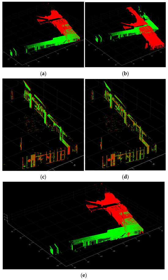 Another frequently employed technique for fine registration is the normal distribution transform (NDT) algorithm [54]. NDT-based registration methods represent point cloud data using probability density functions (PDF) and assess the similarity between these functions. Several variants of NDT have been proposed, involving differentiating the grid size for PDFs [55,56] and evaluating similarity through point-to-distribution or distribution-to-distribution approaches [57]. However, NDT and its variants face similar limitations to ICP, as they also depend on a reliable initial estimation.