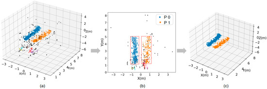 where and are two different points in space, the results of several experiments on the values of , of 0.25, and 2 of 2.75 are relatively good. The results also show that reducing the corresponding weights for the Z-axis components improves the clustering effect. In our experiments, we set the following hyperparameters: eps (DBSCAN radius) = 0.3 and min_samples = 7. Additionally, the algorithm demonstrates improved performance when the experimental distance is maintained as large as possible, preferably greater than 0.3 m. The effect of clustering in the case of multiple people is shown in Figure 4, demonstrating the optimized performance of the algorithm.