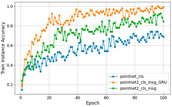 Regarding model selection, we initially adopted the PointNet network [31] as the foundational model and conducted a series of comparative experiments. These experiments encompassed PointNet_cls, PointNet2_cls_msg, and models with corresponding improvements. These experiments were conducted with the same size dataset and the same number of iterations to ensure that the selected models could achieve the best results under the same conditions. Figure 8 shows the training results.