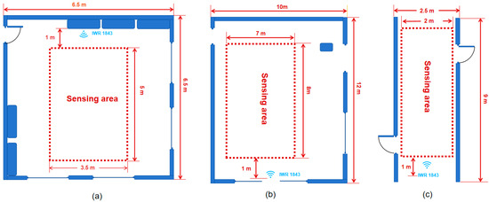 In order to verify the feasibility and validity of the PGGait system, we performed actual scene data acquisition and visualized these data, as shown in Figure 9a–c. In the figures, we marked the data acquisition areas with dashed lines. The dimensions of the acquisition areas for these three scenes are 3.5 m × 5 m, 7 m × 8 m, and 2 m × 8 m. Scene 1 shows the data acquisition screen in a laboratory environment, Scene 2 shows the data acquisition screen in a lobby environment, and Scene 3 shows a corridor that is about 2.5 m wide. However, it should be noted that objects, such as iron doors and glass, on both sides of the corridor may cause unwanted reflections from the radar. Thus, there are some challenges in conducting experimental evaluations in this environment.
