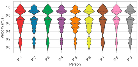In our experiments, we used a commercial radar device to collect point-cloud gait data from nine volunteers in single and two-person scenarios. These subjects consisted of four females and five males, with an age distribution between 18 and 35 years old, weight between 45 kg and 110 kg, and height ranging from 155 cm to 185 cm. Due to the millimeter-wave radar hardware’s horizontal and elevation angle constraints, we positioned the radar at a height of 0.85 m. We maintained a distance of at least 1 m to cover the range of motion of the human body adequately. During data collection, we categorized walking paths into two types: radial straight routes and non-radial routes. We accumulated about 36,000+ frames of data covering both single and two-person scenarios. The differences in limb swing amplitude and stride length of different subjects resulted in different walking speeds. These differences are the basis for performing gait recognition, so we used violin plots better to characterize the differences in walking speeds between users, as shown in Figure 11.