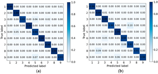 We first evaluate the recognition performance of PGGait in the single-user case. As shown in Figure 12a, we demonstrate the confusion matrix for single-user recognition under radial routes. Of particular note, the average recognition accuracy is an impressive 96.75%. The lowest recognition accuracy among all participants was 92.60%. In addition, as shown in Figure 12b, we also examined the recognition accuracy in the two-person case under a radial route, and the results showed that the average accuracy reached 94.30%. In comparison, the lowest recognition rate was still as high as 91.45%. This set of recognition results validates the excellent performance of the PGGait system in recognizing single users and two-person walking situations with high accuracy.