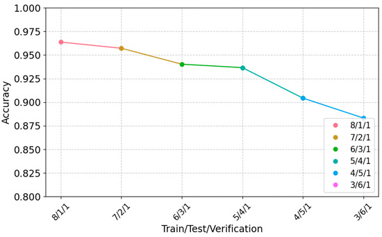 By varying the training, test, and validation data ratio, we evaluated the performance of PGGait at different ratios. In a single-user scenario, we considered various data segmentation ratios and presented the results in Figure 13. These experimental results show that PGGait exhibits strong recognition performance under different data segmentation ratios. Our model performs well, with an average recognition accuracy higher than 93%. Of particular note, the performance is even better when the amount of training data is greater than or equal to the amount of test data. Specifically, our model maintains a recognition accuracy of about 95% when the data training and testing split ratios are above 5:4, demonstrating that PGGait achieves high performance without requiring a large amount of data.