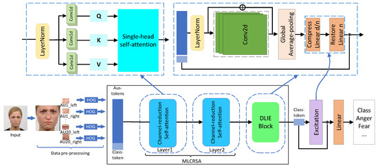 For a given facial expression image , where H and W denote the height and width of a facial expression image, and C the channel of the image, we utilize 20 AU-based tokens and one class token mentioned above to replace the original patch embedding in ViT [25]. Then, these preprocessed tokens become the input to our MLCRSA. We introduce one layer of our MLCRSA called channel reduction self-attention. To be specific, the layer normalization is firstly applied to perform normalization. Then, the output of the layer normalization is defined as , where N is 21, that is, the number of tokens, and L is the length of each of tokens. Then, the 1D convolution operation is adopted to get the query Q, the key K, and the value V that are defined the same as in ViT [25]. The acquirement of Q, K, and V can be expressed with the following formulations: