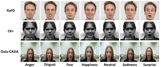 In this subsection, three FER datasets (i.e., Radboud Faces Database (RaFD) [59], Extended Cohn-Kanade (CK+) [60], and Oulu-CASIA [61]) were adopted in the experiments. These datasets were collected in a laboratory-controlled environment. However, the Oulu-CASIA dataset poses a greater challenge compared to the first two datasets due to its intricate background and diverse types of occlusions. Some samples for the three datasets are shown in Figure 2.