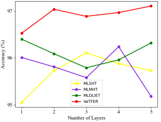 The accuracy of MLSHT, MLMHT, MLDLIET, and VaTFER with different numbers of MLCRA layers on RaFD dataset.