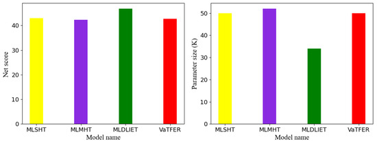 To evaluate the rationality of the network structure in the proposed model, we introduced the metric named Netscore, which was proposed in [76]. The Netscore is calculated by , where A(N) means the network accuracy in percentage, P(N) is the network parameters in M-Params (millions of parameters), and is the number of multiply-accumulate (MAC) operation, which is in G-MACs (billions of MAC operations), and the settings of , , and were 2, 0.5, 0.5, respectively. We evaluated our model by comparing it with MLSHT, MLMHT, and MLDLIET. We chose the best recognition accuracy in Figure 3 for convenience and comparison fairness. The Netscore values of different models are displayed in Figure 4. The results show that the difference between the scores of our VaTFER and the other three models was small, but the accuracy of our VaTFER was higher.