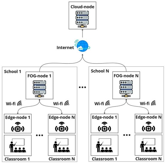 To improve scalability, the system is organized into levels to efficiently accommodate several country-wide schools. Each school deploys a Fog-Node instance for aggregating several classroom Edge-Nodes. All communications between the Cloud-Node and Fog-Nodes, and Fog-Node and Edge-Nodes, are secured by state-of-the-art encrypted channels. Furthermore, each local Fog-Node instance implements backup mechanisms for improving fault-tolerance.