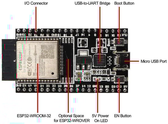 Sensors play a crucial role in this system, as they make it possible to capture real time information about the environment in each monitored classroom. The system measures CO2 concentrations, particulate matter (,  and ), as well as complementary IAQ parameters such as relative humidity and air temperature. The sensors used in our local Edge-Nodes are presented in Figure 5a–c.