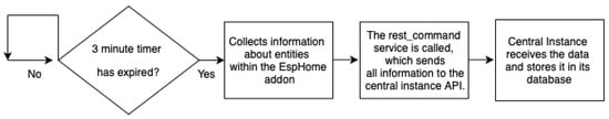 The HA was tailored for running locally, therefore several options had to be explored to allow HA instances to communicate with each other. One of the considered options was the use of MQTT, which provides a broker for handling messages exchanged between publishing and consuming HA instances. This solution was complex to configure given the number of sensors involved. Therefore, it would not scale as well as other available options. Another option was the use of HA Remote HomeAssistant integration, which allows HA instances to communicate with each other remotely. However, all HA Fog and Cloud Nodes instances needed to be exposed on Internet. This was not possible since Portuguese school’s WiFi infrastructures have high level security rules against port forwarding, therefore preventing this integration. The alternative solution was to instantiate a central HA Node, available at the address https://airmon.ufp.pt (accessed on 1 October 2023). The communication with this central HA instance is one way, i.e., only the local Fog-Node instances can send info to the central Cloud instance. The communication process is carried out by configuring an automation in each school Fog-Node instance. As presented in Figure 6, every 3 min, each Fog-Node dynamically executes a script for collecting all data from local EspHome integrations, i.e., from all sensors deployed in all Edge-Nodes installed in the classrooms. The script also sends the collected data via a REST command provided by the Application Programming Interface (API), exposed by the central Cloud-Node instance.