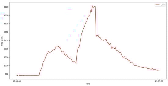 Sensors’ measurements exhibited consistency with scholar activities—the rise and fall of CO2 concentrations correspond to classes on the five working days of the week. International indoor air quality guidelines indicate 1000 ppm as the reference value for CO2 concentration, and consider 2000 ppm as the intervention value for this pollutant []. The results obtained in the classrooms of University Fernando Pessoa show high levels of CO2 concentration during classes, highlighting the importance of continuously monitoring CO2 levels to support decisions regarding ventilation practices (e.g., opening windows) for IAQ improvement.