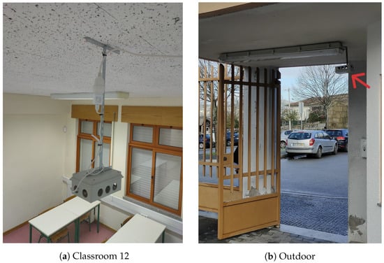 The Alpendorada high school building has two floors and a total area of 6480 m2. The prototypes were assembled in two classrooms (Figure 12a). Both classrooms are on the first floor and partially face the prevailing NW winds. Classroom 12 has 44.8 m2 and 28 seats. Classroom 13 has 49.0 m2 and also 28 seats. Both have 3.0 m ceilings and natural ventilation with four free-opening tilt-and-turn windows of 0.72 m2 each. Since the SchoolAIR framework aims to support decision-making in ventilation management, it is of the utmost importance to obtain data regarding outdoor conditions. For this purpose, a monitoring node has also been installed in outdoor environment (Figure 12b). The outdoor monitoring location is sheltered from the rain, and faces the prevailing NW winds. The partner teachers and students were able to assemble and deploy the Edge-Nodes and respective sensors in all selected locations.