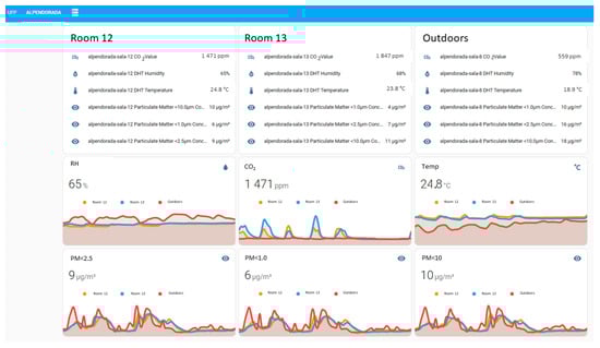 Data from the monitoring Motes (CO2, particles ,  and , T and RH) in each classroom and outdoors (Figure 15) was collected continuously and registered every five minutes.