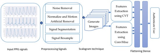 The following phases have been developed to integrate PPG and deep learning (DL) for biometric authentication, as shown in Figure 1. This research presents a pioneering methodology that significantly advances the field of biometric authentication, particularly in the context of Photoplethysmography (PPG) and deep learning (DL) techniques. It introduces a novel representation called a Scalogram, which visually captures time-varying frequency components of multiple PPG signal segments. This innovative approach enhances the system’s robustness and reliability. A biometric authentication system is developed using deep learning techniques, specifically the CVT-ConvMixer hybrid classifier. This model combines the strengths of both architectures, improving feature representation and information extraction. It excels in real-world scenarios, accurately identifying individuals despite signal variations. Attention mechanisms are integrated into the ConvMixer model to capture temporal relationships and informative features within PPG signals. This enhancement significantly boosts the model’s ability to distinguish genuine users. In practice, this research introduces innovative techniques for handling PPG signal variability, harnesses the power of deep learning for biometric authentication, and achieves high accuracy in identifying individuals, showcasing its potential for real-world applications in security and authentication. These steps are described in the subsequent paragraphs.