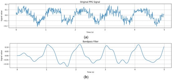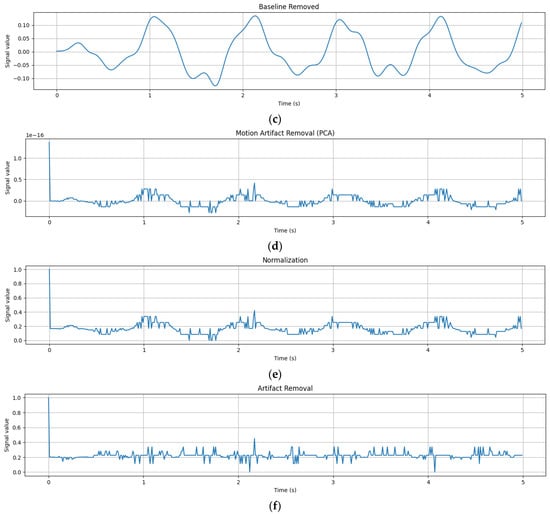 An example of a visual representation of preprocessed PPG signals is (a) the original input of PPG signals; (b) the application of a bandpass filter; (c) baseline removal; (d) motion artifact removal by PCA; (e) signal normalization and resampling; and (f) artifact rejection.