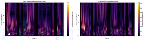 Visual representation of the frequency content of multiple PPG signal segments using the Scalogram technique for (a) person 1 and (b) person 2.