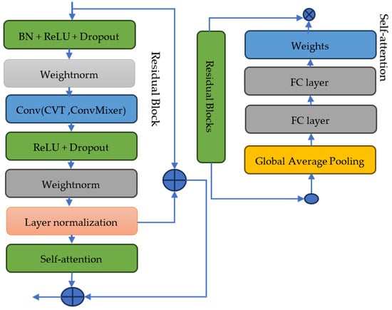 The architecture of the proposed CVT-ConvMixer model includes a residual block and a self-attention module.