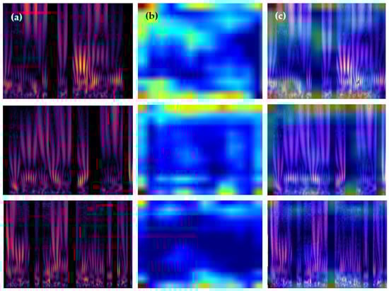 Figure 12 in our study illustrates the Gradient-weighted Class Activation Mapping (Grad-CAM) analysis of our CVT-ConvMixer model, applied to PPG 2D-scalogram signals. Figure 12a shows the original 2D-scalograms for three individuals, highlighting the model’s input; (b) displays heatmaps generated by Grad-CAM, pinpointing regions crucial for the model’s predictions; and (c) presents superimposed images, merging the original scalograms with their heatmaps to visualize the model’s focus areas. This figure demonstrates the model’s proficiency in identifying and differentiating key biometric patterns within the PPG signals, underscoring its effectiveness in biometric authentication.