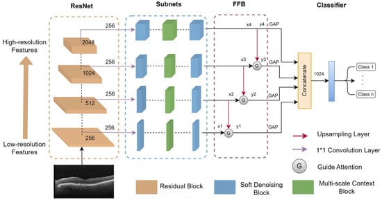 - The feature fusion block (FFB) is designed to combine low-resolution and high-resolution features, enabling more accurate identification of retinopathy at various scales in OCT images.