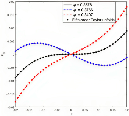 To represent the relationship between force and displacement more intuitively and to simplify the calculations, a fifth-order Taylor series expansion is performed around under small excitation. As shown in Figure 3, the fifth-order Taylor expansion closely approximates the original expression.