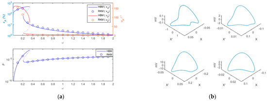 By using the Runge–Kutta method for numerical simulation, the stability of the calculated results is verified. The frequency-amplitude curves obtained by the Harmonic Balance Method (HBM) and the Runge–Kutta Method (RKM) are also shown in Figure 4a. It can be observed from Figure 4a that before the frequency downward jump points, there is a significant difference in the phase difference curve between the HBM curve and RKM. This difference arises from the presence of numerous higher-order harmonics near the frequency jump band. The vibration response calculated by the RKM contains harmonics. When estimating the phase difference from results with numerous harmonics, the error is relatively large. Figure 4b shows excitation frequencies of 0.03, 0.1, 0.2, and 0.3, respectively. It can be observed from Figure 4b that under low-frequency excitation, the displacement response and output voltage contain not only the fundamental frequency component but also higher harmonic components. However, compared to the fundamental frequency component, the amplitude of the higher harmonic components is relatively small. In Figure 4b, as the excitation frequency increases from 0.03 to 0.3, the higher harmonic components gradually disappear, and the vibration response is gradually dominated by the fundamental frequency. It is precisely because the higher harmonic components are significant at low frequencies, and the HBM method ignores these higher harmonic components, that the HBM method and RKM method exhibit certain differences in the low-frequency range. From Figure 4a, it can be seen that except for the points before the frequency of 0.3, the results obtained using the two methods show good consistency.