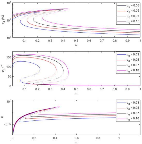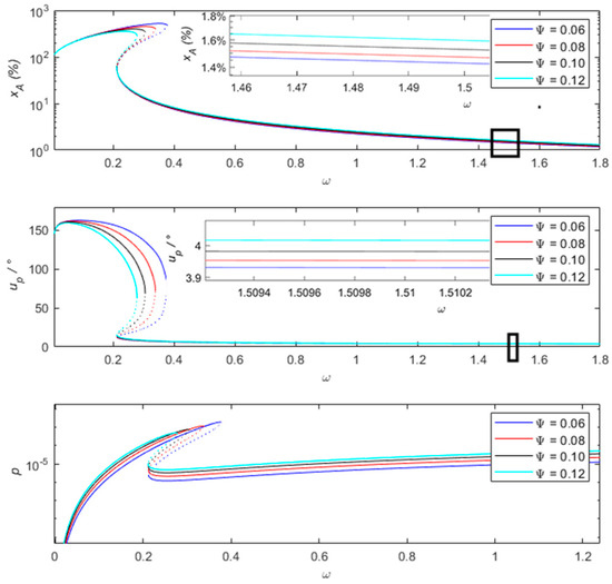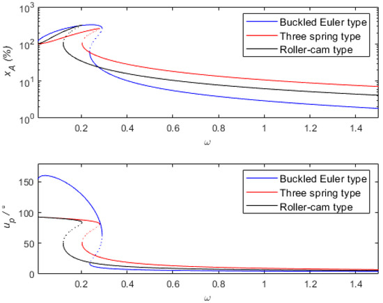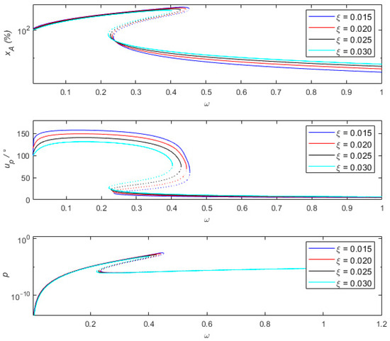 The same as before, the dashed lines in the figure represent the unstable solutions of this system. The motion differential equation of Formula 34 shows that the entire system has two main sources of damping. One comes from the damping of the spring or the damper connected in parallel with the spring. In addition, the energy harvesting mechanism can be equivalently considered as a nonlinear damping to a certain extent. During the vibration process, when the amplitude of relative motion is relatively large, the equivalent damping ratio is also relatively large. Conversely, the equivalent damping ratio is small. Therefore, properly reducing the linear damping and increasing the piezoelectric coupling coefficient can be beneficial for both vibration sensing and vibration energy harvesting.
