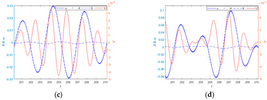 (a) shows the measurement performance and the output voltage of the system when the periodic excitation is . (b) shows the measurement performance and the output voltage of the system when the periodic excitation is . (c) shows the measurement performance and the output voltage of the system when the periodic excitation is . (d) shows the measurement performance and the output voltage of the system when the periodic excitation is .