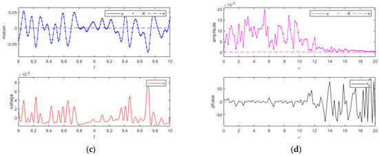 (a) The motion and the output voltage diagram of the system are shown when the standard deviation is 0.5. (b) The motion amplitude and phase diagram of the system are shown when the standard deviation is 0.5. (c) The motion and the output voltage diagram of the system are shown when the standard deviation is 0.2. (d) The motion amplitude and phase diagram of the system are shown when the standard deviation is 0.2.