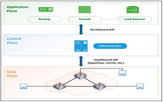 SDN enables the resolution of various limitations present in current network architectures (i.e., operating and hardware costs, network misconfigurations, and related errors) by separating the control and data planes. This transformation shifts static networks towards highly programmable and adaptable ones and offers numerous benefits including robustness, flexibility, performance, usability, scalability, manageability, and security. SDN architecture comprises three primary structures: the application plane, control plane, and data plane (Figure 1).